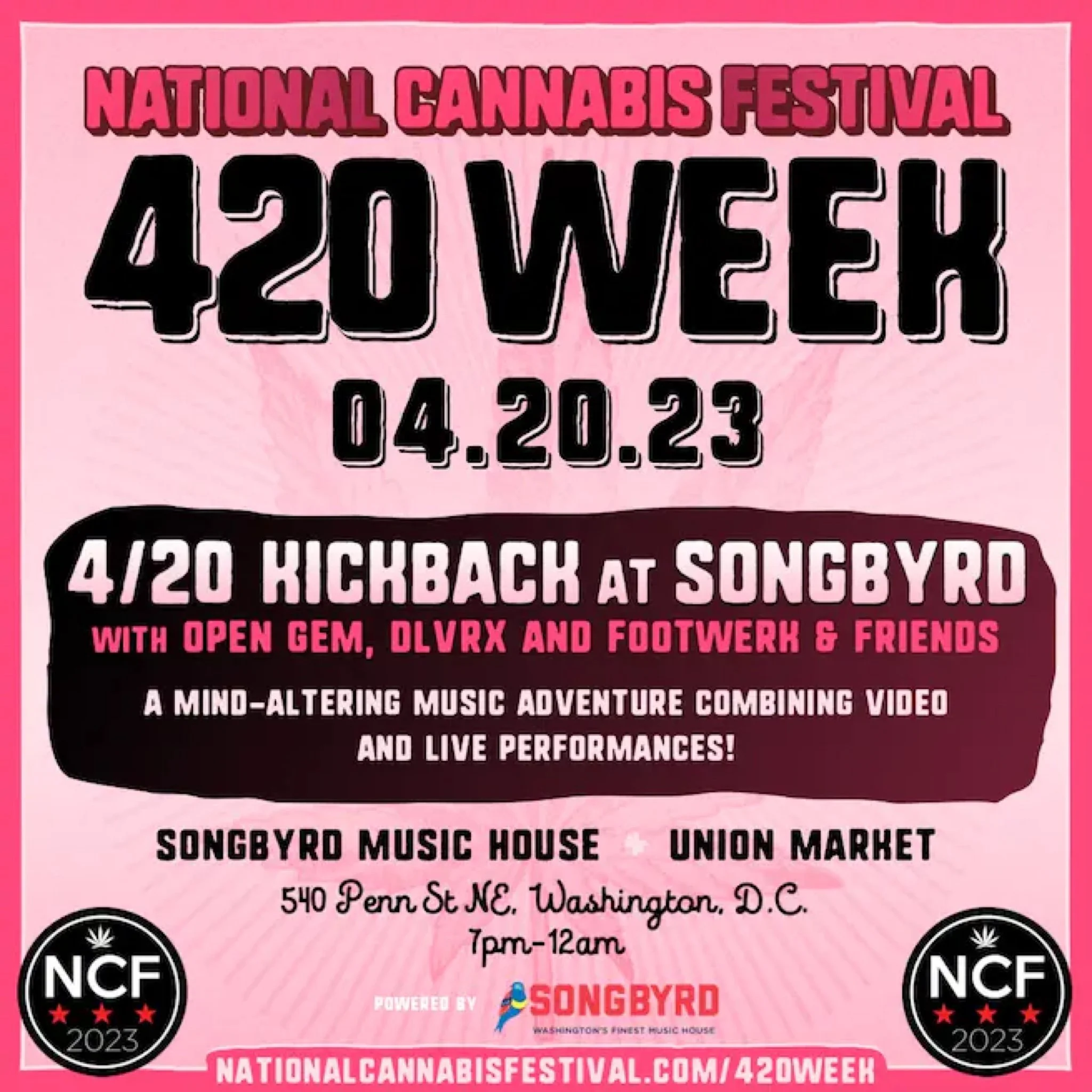 Join NCF, Songbyrd, Open Gem & DLVRx for the official 420 Kickback Music Showcase on Thursday, April 20th, from 8pm to Midnight (Doors at 7pm) for a mind-altering music adventure combining video and live performances by:
